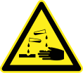 This features a yellow triangular sign with black writing on it. The sign is placed in the center of the frame, and its message seems to be related to corrosive materials or hazardous substances. The sign's shape and color make it easily noticeable and convey important information about potential dangers associated with the area.