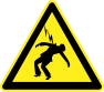 This features a yellow triangular sign with an illustration of a man falling or being electrocuted. This warning sign is meant to convey the potential danger associated with high voltage, and it serves as a cautionary measure for those who may come across such hazards. The sign's design is simple yet effective in communicating its message, making it easily recognizable by passersby or individuals working in environments where electrical hazards are present.