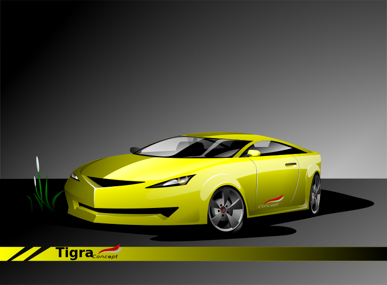This features a yellow sports car with a convertible top, parked on the side of a road. It is positioned in front of a grassy area and appears to be facing left. The background and ground are both gray, creating a contrasting effect against the vibrant color of the vehicle. A thick yellow line runs across the image, displaying the words "tigra concept" on it, likely indicating that this is an illustration or promotional material for the sports car brand.