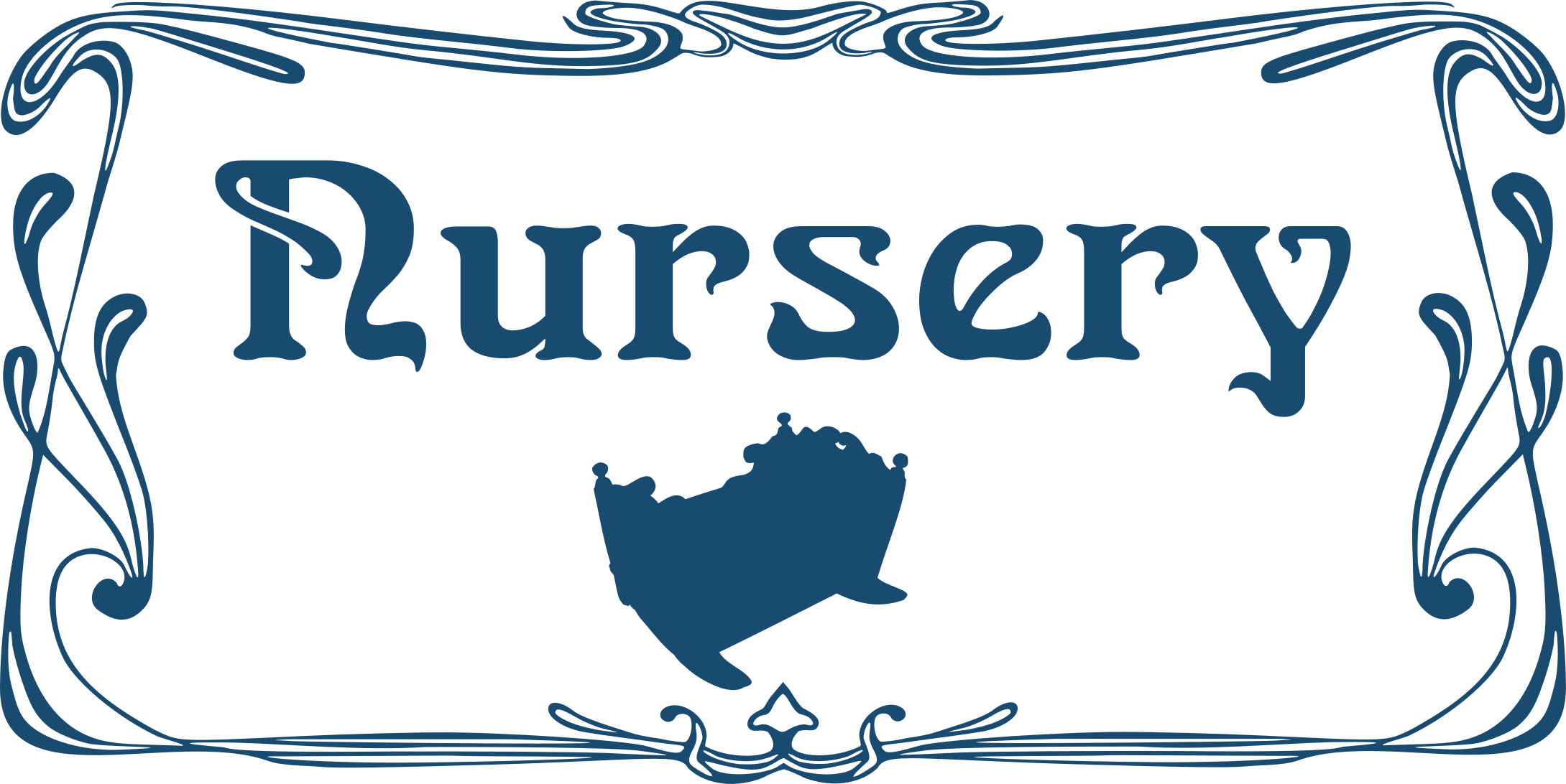 This features a blue sign with the word "Nursery" written in the middle of it. The sign has a rectangular shape and is bordered by a blue line, giving it an elegant appearance. Below the word "Nursery," there is a cradle depicted on the sign, adding to its charm and appeal. This sign could be used for various purposes such as advertising a nursery or daycare center, or even as a decorative piece in a child's room. The combination of the word "Nursery" and the cradle creates an inviting atmosphere that is both visually appealing and meaningful.