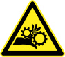 This features a yellow triangular sign with an illustration of gears and a warning message. The sign is placed in the center, occupying most of the frame. The illustration consists of two circles, one on top of the other, with multiple gear-like shapes inside them. These gears are arranged to resemble a tree or a mountain, giving the impression that they are growing out of the ground. The sign is likely meant to convey caution and alert people to potential hazards in the area.