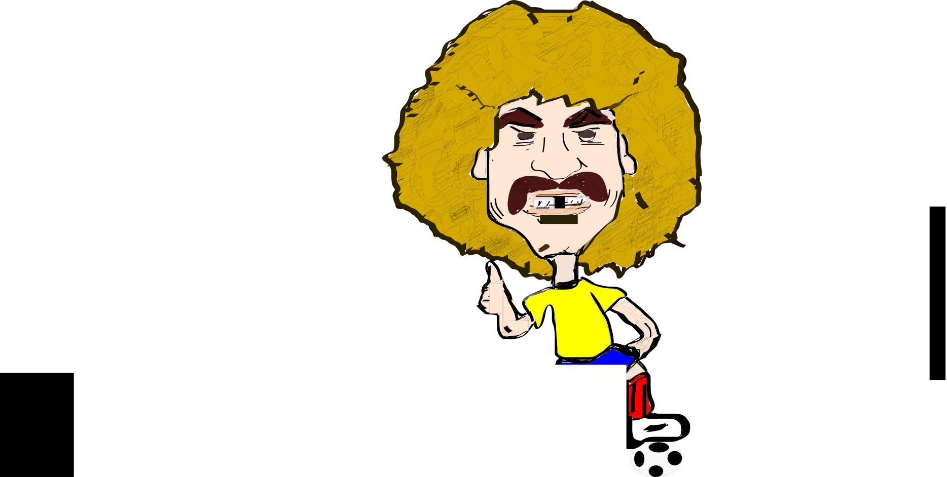 This features a man with big hair, wearing a yellow t-shirt and blue shorts. He has a mustache and is pointing his finger upwards, giving the impression of being animated or drawn. His facial expression appears to be angry or displeased as he points at something in the distance. The overall scene gives off an artistic vibe with its bold colors and unique character design.
