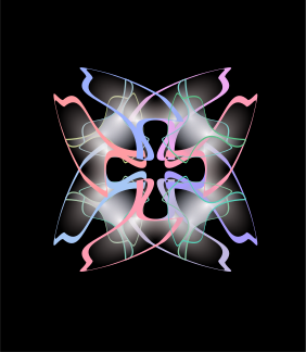 This is a colorful and abstract design featuring a large, circular shape with multiple smaller circles surrounding it. These smaller circles are connected by lines that create an intricate pattern throughout the entire composition. The colors used in this artwork are predominantly blue, pink, and green, creating a visually striking piece of art. The overall effect is one of complexity and beauty, showcasing the artist's skill in crafting a captivating design.