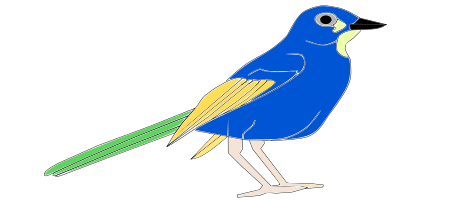 This features a blue bird with yellow wings and green tail, standing on one leg. It appears to be a cartoon or illustration of the bird, possibly for educational purposes or as an artistic piece. The bird's vibrant colors make it stand out against the background, which is likely white in color. This image could be used to teach children about different types of birds and their unique features, or simply as a decorative element that adds a touch of nature to any space.