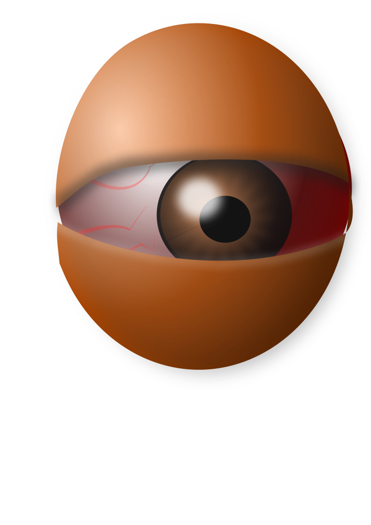 This features a close-up of an eye, which appears to be made out of a brown egg. The eye is the main focus of the picture and has a red iris surrounding it. The egg itself seems to have been crafted with care, giving it a unique appearance. This artistic representation of an eye might evoke curiosity or intrigue in viewers, as it is not something one would typically see every day.