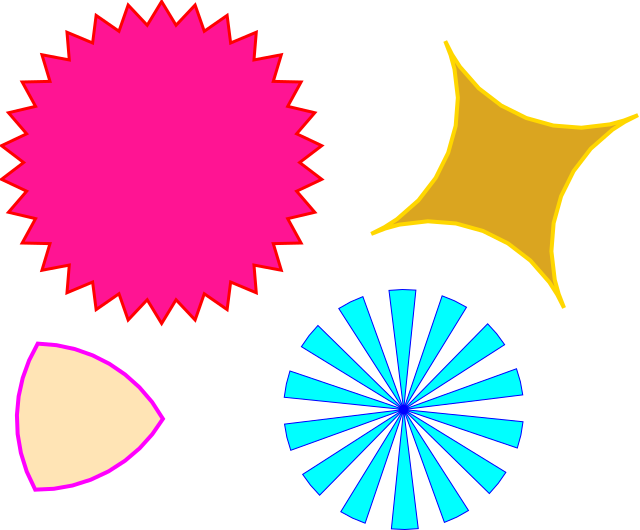 This features four different shapes, each with unique characteristics. In the top left corner, there is a pink circle with triangular spikes all over it, creating an interesting and eye-catching design. On the right side of the top, there is a yellow star shape that stands out against its surroundings. In the bottom left section of the image, there is a triangle shape with curved lines and pink outlining, giving it a distinctive appearance. Lastly, in the bottom right corner, there is a blue fan-shaped object that adds variety to the collection of shapes. These four different shapes create an interesting visual display, showcasing various design elements and colors.