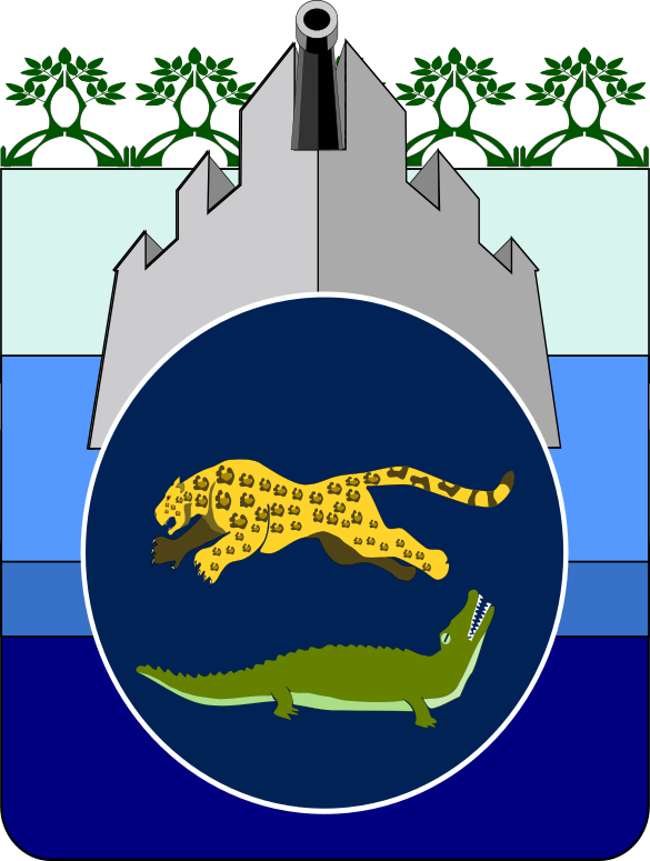 This features a coat of arms with a yellow and black tiger as the main focus. The tiger is depicted in mid-leap, capturing its dynamic nature. Surrounding the tiger are several alligators, each varying in size and position. Some alligators can be seen on the left side of the coat of arms, while others are located towards the right side. The coat of arms is set against a backdrop of blue water, creating an appealing visual contrast between the tiger and the aquatic elements. The combination of the tiger and alligators in this design suggests a connection to nature or perhaps a representation of strength and power.
