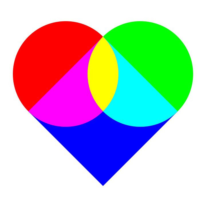 This features a heart made up of four different colored circles and a square. The heart is divided into two sections, each section consisting of one red circle, one yellow circle, one blue circle, and one green circle. These colors are arranged in such a way that they create the appearance of a heart shape. The heart is displayed prominently on a white background, making it stand out as an artistic representation of love or affection.