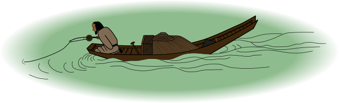 This features a person in a boat, paddling through the water. They are holding onto an oar and appear to be navigating their way across the lake. The scene is reminiscent of Song Dynasty Chinese painter Ma Yuan's Angler on a Wintry Lake, which depicts the oldest known image of a fishing reel. In this particular image, however, the focus is on the person in the boat rather than the fishing aspect. The person appears to be enjoying their time out on the water, possibly engaging in leisurely activities or exploring the lake.