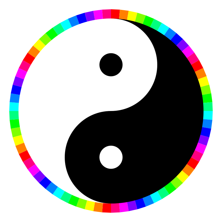 This features a colorful circle with a black and white yin-yang symbol in the center. The yin is represented by a black background, while the yang is depicted as a white circle. Surrounding the yin-yang symbol are vibrant colors that create a rainbow effect, adding a lively touch to the design. This unique and eye-catching image could be used for various purposes such as decoration or promoting mindfulness and balance in life.