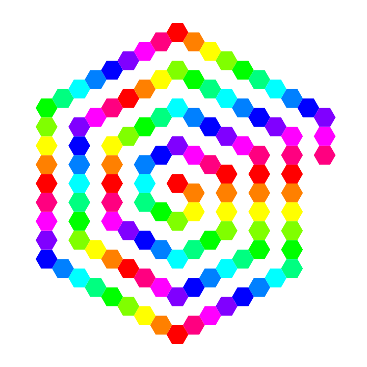 This features a large, colorful spiral made up of many small hexagons. Each hexagon is uniquely colored and arranged in a visually appealing pattern. The spiral appears to be a three-dimensional representation, with each hexagon stacked on top of one another to create the illusion of depth. This intricate design showcases the artist's skill in creating an eye-catching and engaging visual piece using simple geometric shapes.