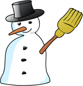 This features a cartoon snowman wearing a black hat and holding a yellow broom. The snowman is standing in front of a white background, which provides a clean and uncluttered backdrop for the scene. The snowman's facial expression appears to be smiling, adding a sense of warmth and friendliness to the image.