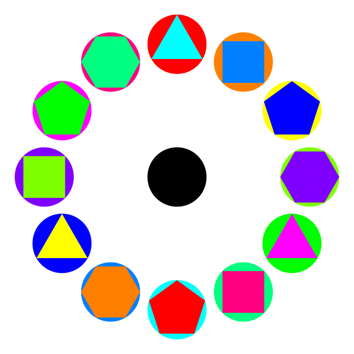 This features a circle with twelve different colored polygons arranged around it. Each polygon is placed in the center of its corresponding color, creating an interesting and visually appealing pattern. There are three of each type of polygon, making for a total of six unique shapes. In addition to these polygons, there is also a black circle in the middle of the circle, adding contrast and balance to the overall composition. The use of different colors and shapes creates an engaging visual experience that captures the viewer's attention.