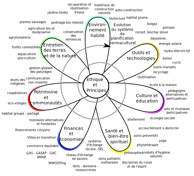 This is a diagram that shows various aspects of permaculture. It has multiple circles, each representing different elements of the concept. One circle represents agriculture and farming, while another one focuses on energy production. There are also circles for education, communication, and social aspects of permaculture. The diagram is colorful, with each circle having a distinct color to differentiate it from other circles. The image provides an overview of the different elements that make up the concept of permaculture, making it easy to understand and visualize the interconnectedness of these various aspects.
