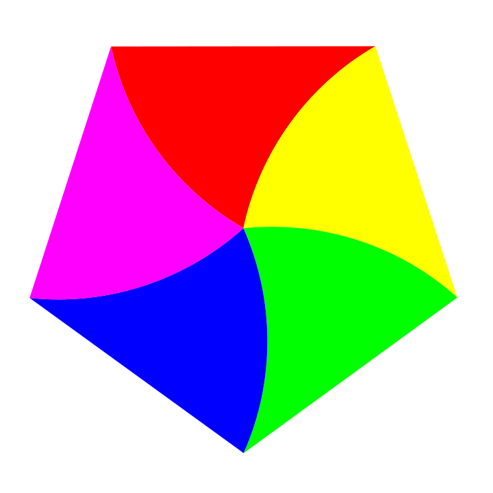 This features a colorful, geometric shape that resembles a swirly pentagon. This unique design is made up of five distinct sections, each with its own vibrant hue. The colors include blue, yellow, green, red, and pink, creating an eye-catching display. The combination of these different colors gives the image a lively and dynamic appearance, making it visually appealing and engaging for viewers.