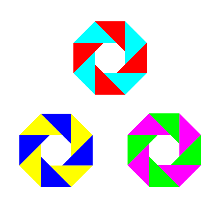 This features three different colored geometric shapes, each with a unique design. Two of the shapes are blue and yellow, while the third one is red and green. These shapes are arranged in a triangular formation, creating an interesting visual effect. Each shape has a distinct pattern that adds to the overall appeal of the composition. The colors used for these shapes create a vibrant and lively atmosphere, making it an eye-catching image.