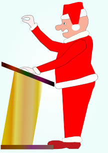 This features a colorful cartoon character dressed in a red and white Santa Claus suit, standing at a podium. He appears to be giving a speech or presentation, with his arms raised as if he is gesturing towards the audience. The Santa figure has a smiling face, adding a cheerful touch to the scene. The background of the image consists of a colorful rainbow, which adds vibrancy and depth to the overall composition. This unique combination of elements creates an engaging visual experience that captures the attention of viewers.