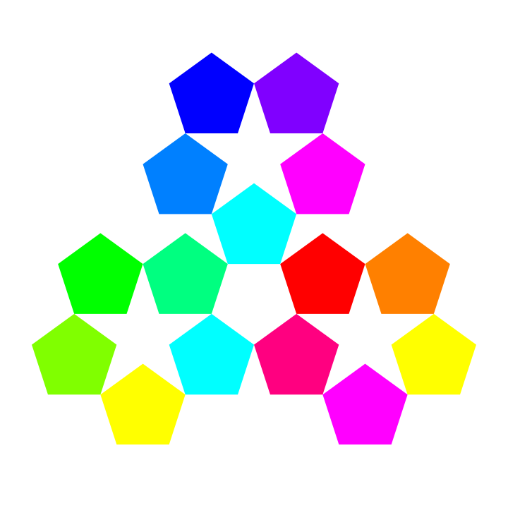 This features a colorful and intricate design made up of various pentagons. Each pentagon is uniquely colored, with some featuring bright hues such as yellow, pink, blue, green, orange, and red. These pentagons are arranged in an organized manner, creating a visually appealing pattern that resembles a star or a stacked structure. The combination of these vibrant colors and the geometric shape of the pentagons make for an eye-catching and artistic display.