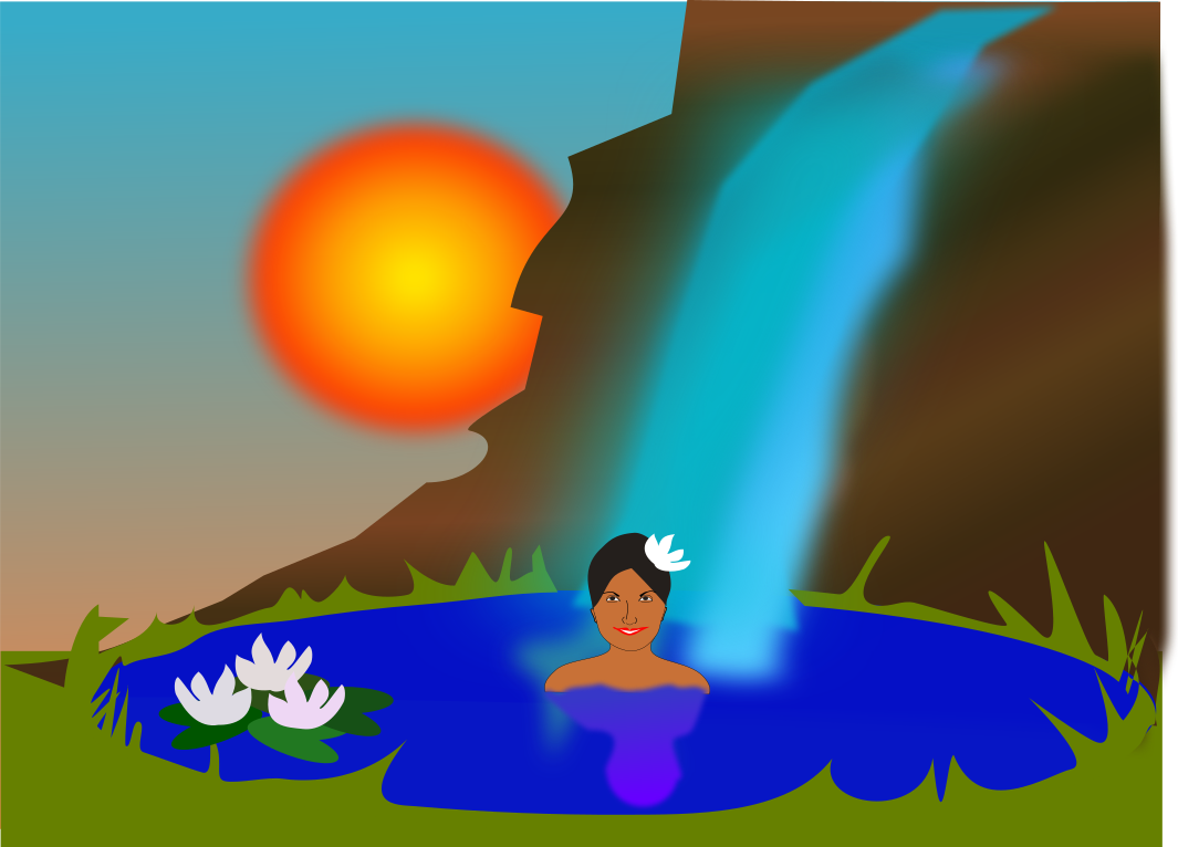This features a woman sitting in a serene outdoor bath under a waterfall. She is surrounded by lily pads, and has a flower in her hair. The scene takes place near a cliff with an orange sun peaking out from behind it, creating a picturesque atmosphere. The combination of the waterfall, the woman's peaceful demeanor, and the natural elements create a sense of tranquility and relaxation.