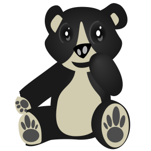 This features a black and beige teddy bear sitting down with its paws crossed. It has a smiling expression, giving it a friendly appearance. The bear is positioned in the center of the scene, occupying most of the frame. Its design appears to be simple yet charming, making it an appealing image for children or anyone who enjoys cute animal illustrations.