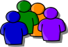 This features a group of four people standing together, each person is represented by a colorful figure. The figures are positioned in such a way that they appear to be interacting with one another. Each person's figure has a distinct color: blue, green, orange, and purple. These colors represent the different individuals within the group, creating an interesting visual representation of people coming together.