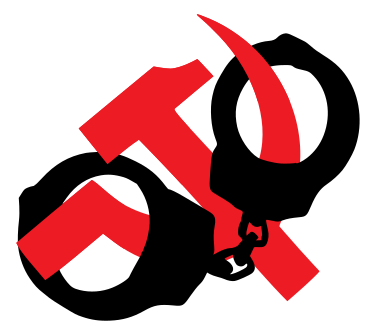 This features a red hammer and sickle symbol, which is the emblem of communism. Surrounding this central symbol are two sets of black handcuffs, one on each side. These cuffs appear to be locked together, creating an interesting visual effect. The overall composition of the image suggests a strong message against anti-communist sentiment or ideologies.