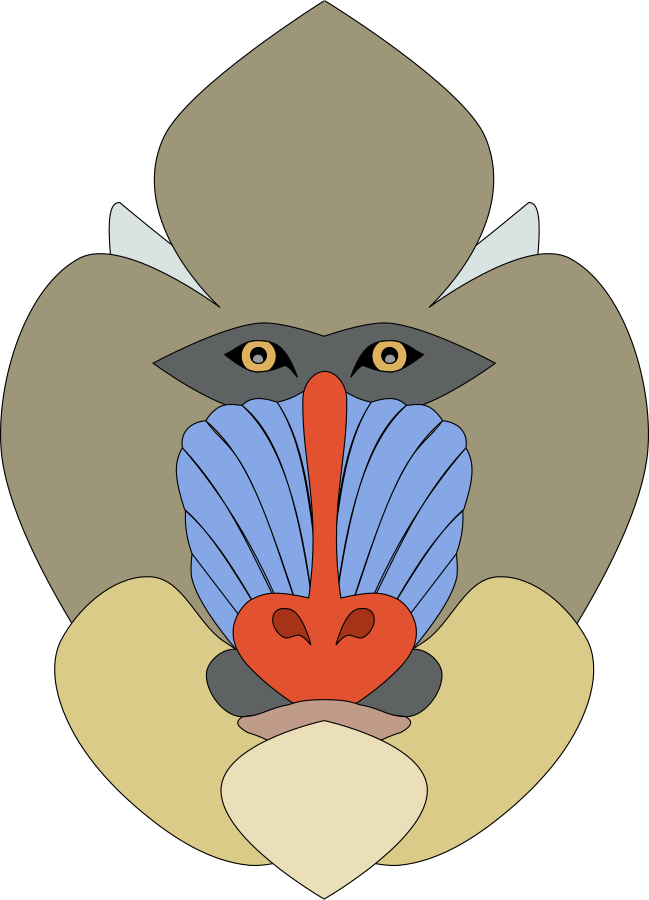 This features a colorful and unique monkey face with an orange nose. The monkey's mouth is open, giving the impression that it might be making a funny or playful expression. The monkey has blue eyes, adding to its distinctive appearance. The overall design of the monkey appears to be a mix between a cartoon and a realistic representation.
