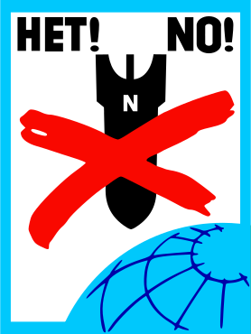 This features a poster with a red circle and the word "het" written in it. Above this, there is an illustration of a bomb or missile, which appears to be the source of the red circle's message. The poster also has a blue background, giving it a contrasting appearance. This artwork seems to convey a strong anti-war sentiment, as the red circle and the word "het" are often associated with the Dutch language, where "het" means "it" or "the."