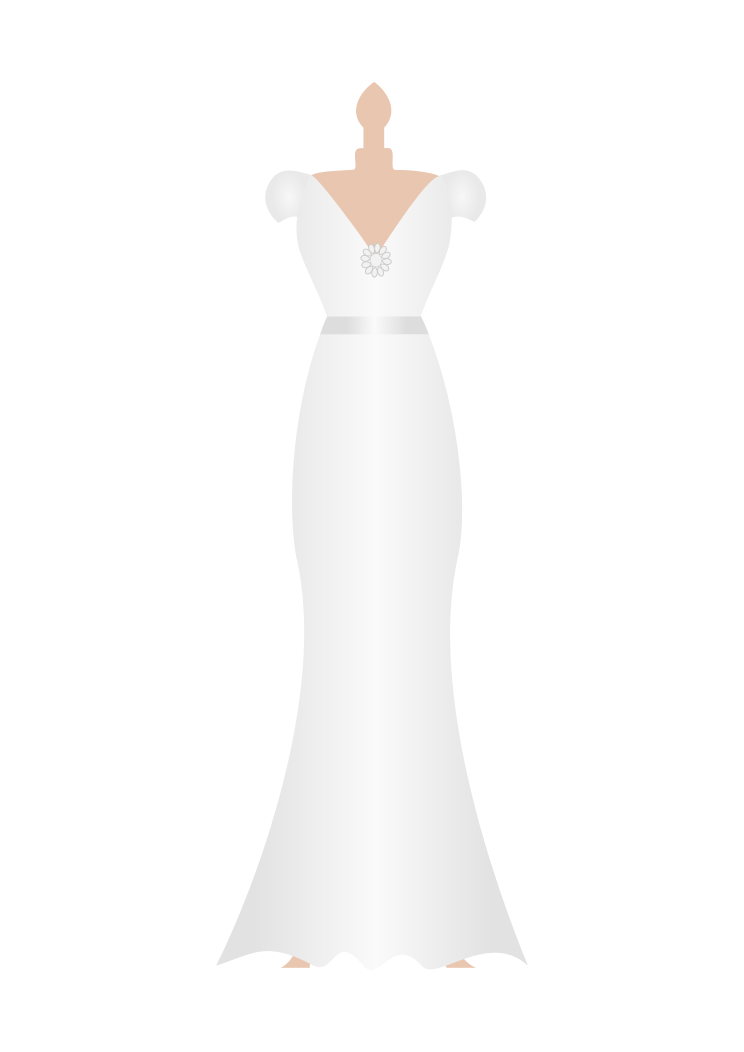 This features a white wedding dress, which is elegantly draped over a mannequin. The dress has a V-shaped neckline and is adorned with a brooch on the V line, adding an extra touch of sophistication to its design. The dress appears to be made from high-quality fabric, giving it a luxurious appearance. The overall effect is one of elegance and refinement, making this wedding dress an ideal choice for brides seeking a timeless and beautiful look on their special day.