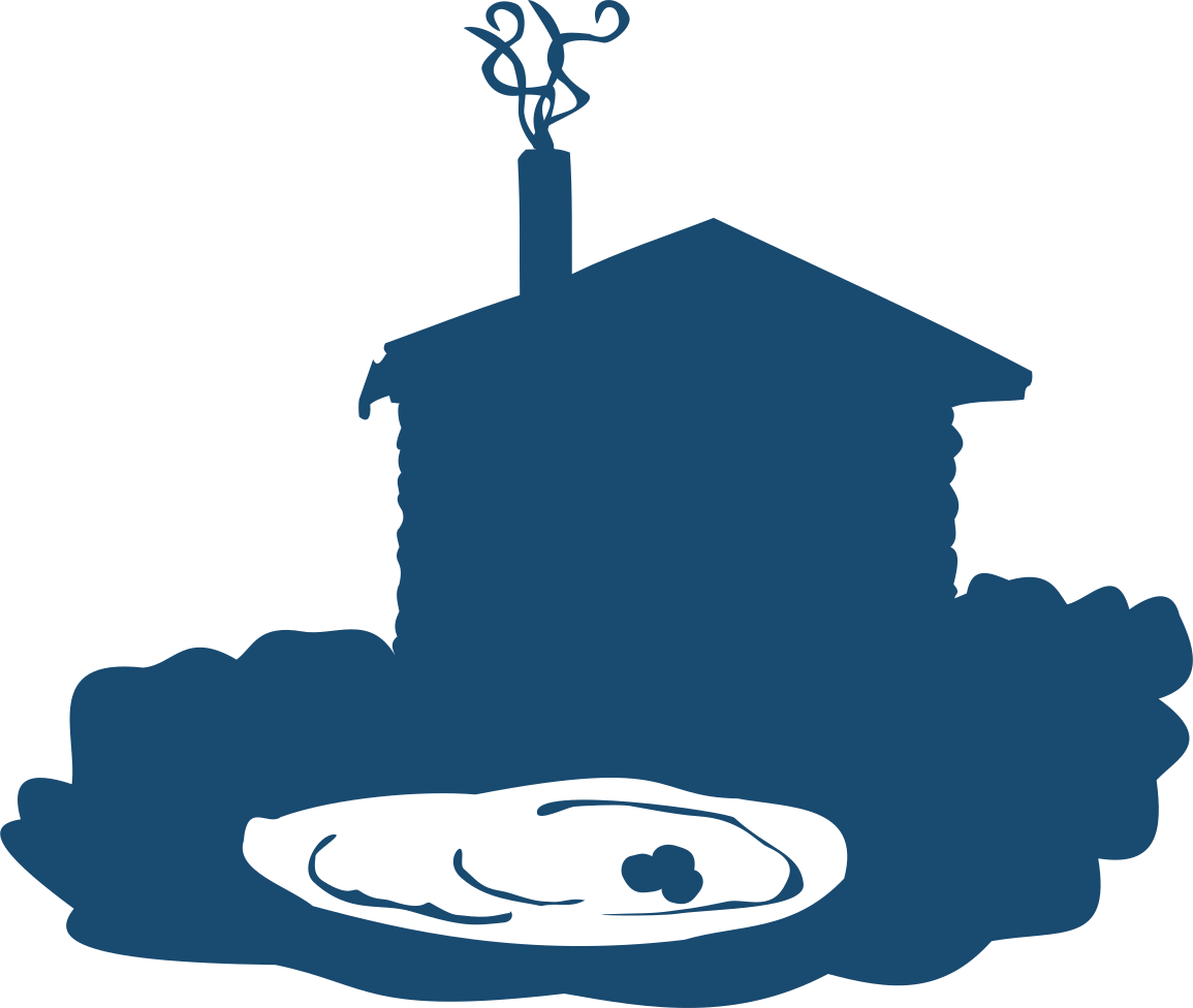 This features a silhouette of a house with smoke coming out of the chimney. In front of the house, there is a small pond that adds to the serene atmosphere of the scene. The house itself appears to be made of wood and has a cozy, rustic charm. The combination of the house's design and the presence of the pond creates an idyllic countryside setting.