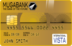 This features a yellow Mugabank credit card with the words "The Bank of the Future" written on top. It has a chip on the left side and is emblazoned with an international vista sign on the bottom right corner. The card also displays the expiration date, which reads 03/21.