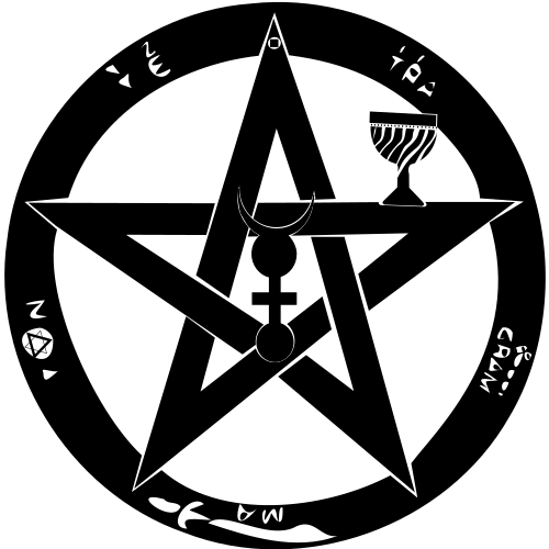 This features a black and white circle with various symbols, including an upside-down pentagram. In the center of the circle is a cup, which appears to be a chalice or a wine glass. There are also two bowls placed around the circle, one on the left side and another on the right side. The combination of these elements creates a unique and intriguing design that may represent a magical or spiritual symbolism.