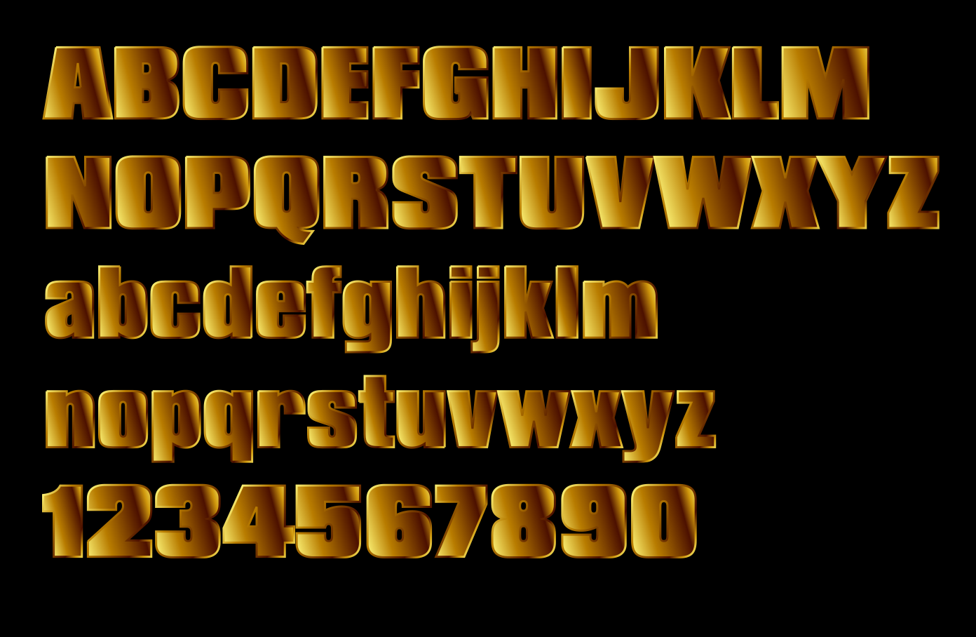 This features a large, bold, and gold alphabet displayed in various sizes. The letters are arranged in rows, with some larger than others, creating an eye-catching visual effect. The font appears to be a mix of uppercase and lowercase letters, making it versatile for different uses such as headlines or body text. Overall, the image showcases a striking and elegant display of lettering that can be used in various design projects or simply appreciated for its artistic value.