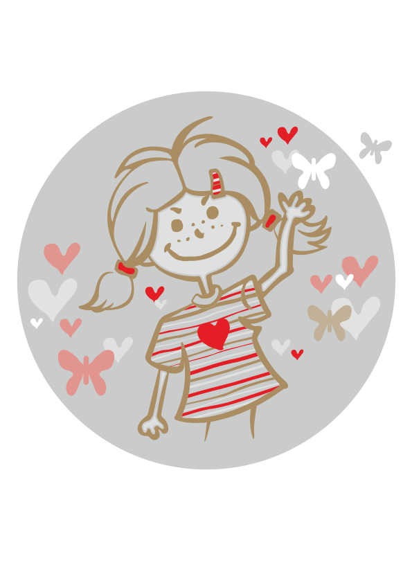 This features a round, colorful circle with a smiling cartoon girl in the center. She is wearing a red and white striped shirt and has hearts on her headband and around her neck. In addition to the main character, there are several butterflies scattered throughout the scene, adding a playful touch to the overall design. The combination of the smiling girl, hearts, and butterflies creates a cheerful and whimsical atmosphere in this artistic piece.
