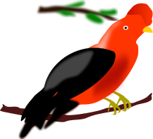 This features a red bird with black wings perched on a thin branch. It appears to be an illustration or drawing, possibly of a cardinal or another similar species. The bird is the main focus of the scene and occupies most of the frame. The branch it sits on is located towards the bottom right corner of the image.