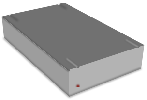 This features a large grey box with a red dot on it. It appears to be an electronic device, possibly a computer component or storage unit. The box is placed on a white background, which provides a clean and uncluttered appearance. The red dot stands out against the grey surface of the box, drawing attention to its location. Overall, the image presents a simple yet visually appealing scene with an emphasis on the red dot.