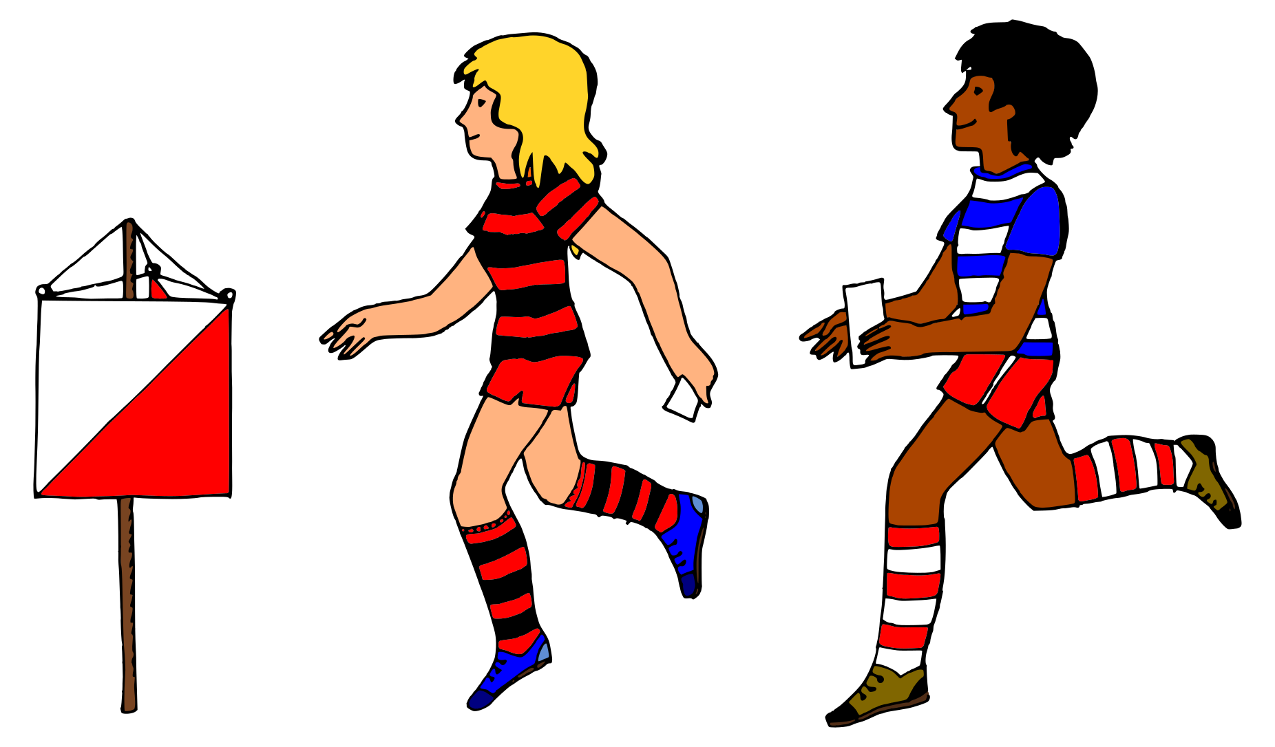 This features two people running on a track, each wearing different colored socks. One person is dressed in red and blue striped shorts while the other has white and red stripes. They are both holding flags as they run, with one flag being held higher than the other. The scene appears to be a cartoon or comic book illustration of two people engaging in an athletic activity.
