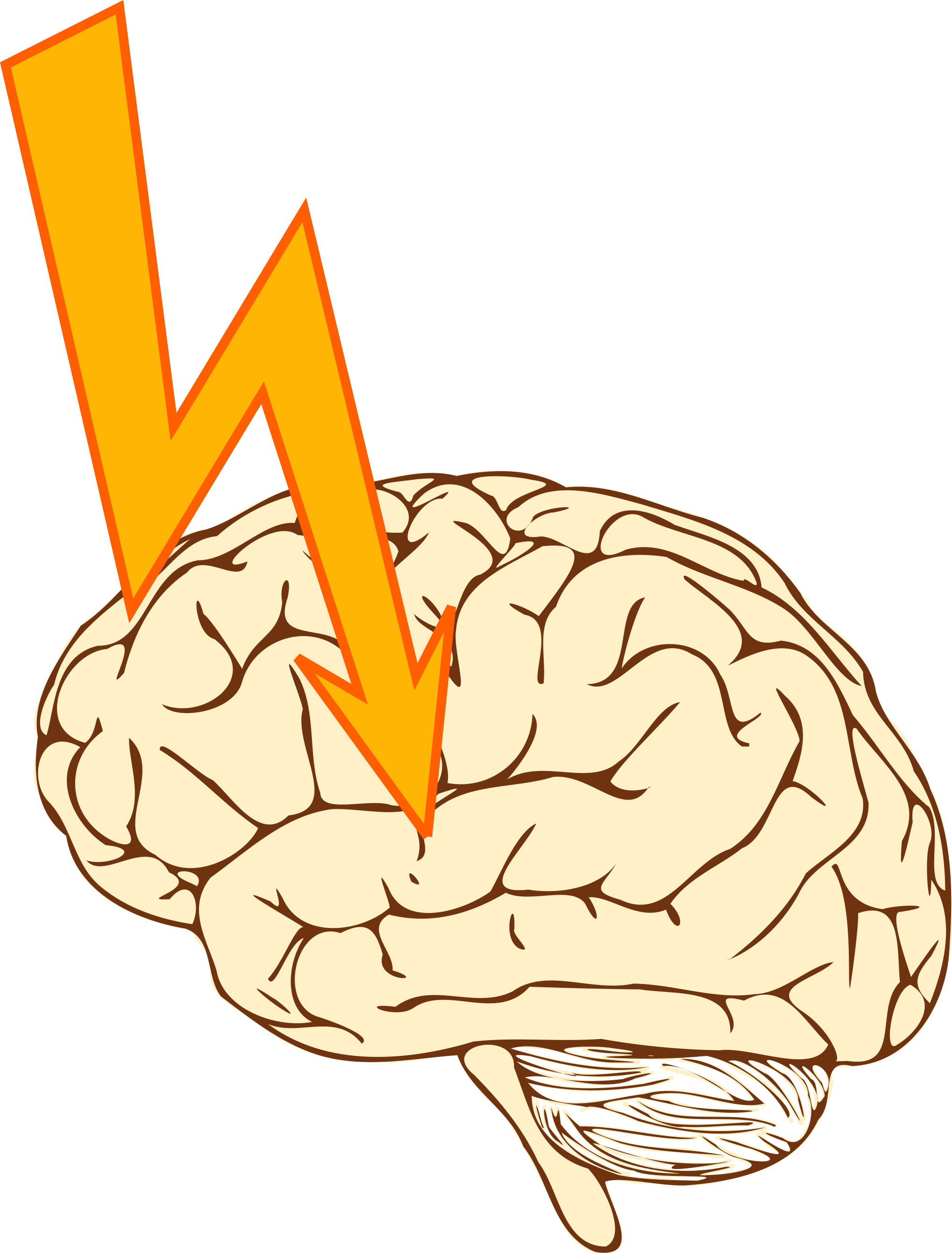 This features a close-up of the human brain, with an orange lightning bolt pointing towards it. This lightning bolt is located at the top of the brain, creating a striking visual effect. The brain itself occupies most of the image, extending from the left side to the right side and filling up the majority of the frame.