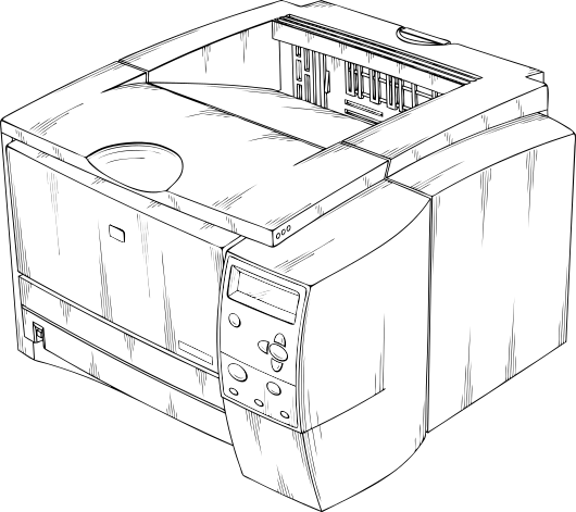 This is a hand-drawn illustration of an old-fashioned laser printer. It features a large, open box with the top removed to reveal its interior components. Inside the printer, there are several buttons and knobs that control various functions. These include a power button on the left side, a few smaller buttons in the middle, and two larger buttons towards the right side of the machine. The illustration is done in black and white, giving it an antique appearance.