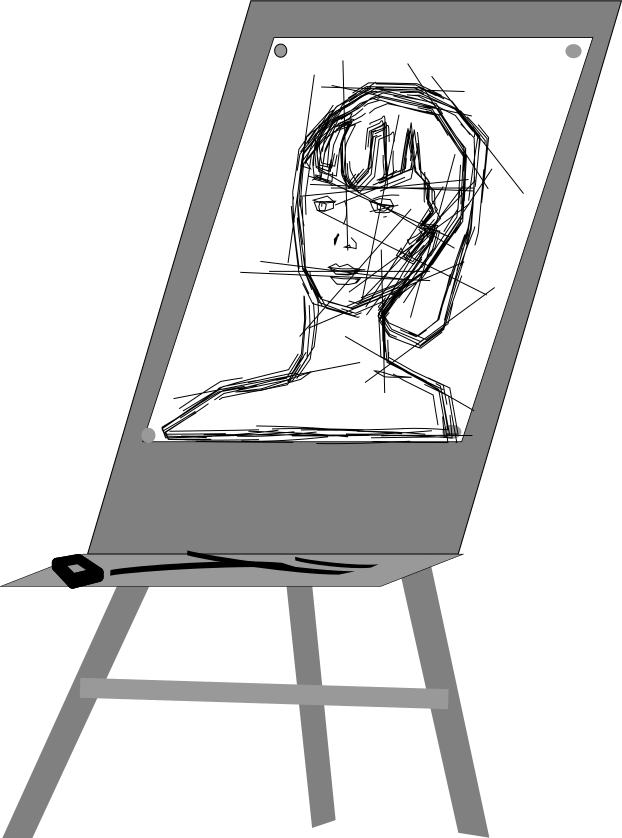 This features a drawing of a woman's face on the screen of an easel. The drawing is in black and white, giving it a classic appearance. The woman appears to be looking at something off-camera, as if she is engaged in conversation or observing her surroundings. The drawing itself seems to be a portrait, capturing the essence of the subject's features with precision and skill. Overall, the image showcases an artistic representation of a person through their facial features.