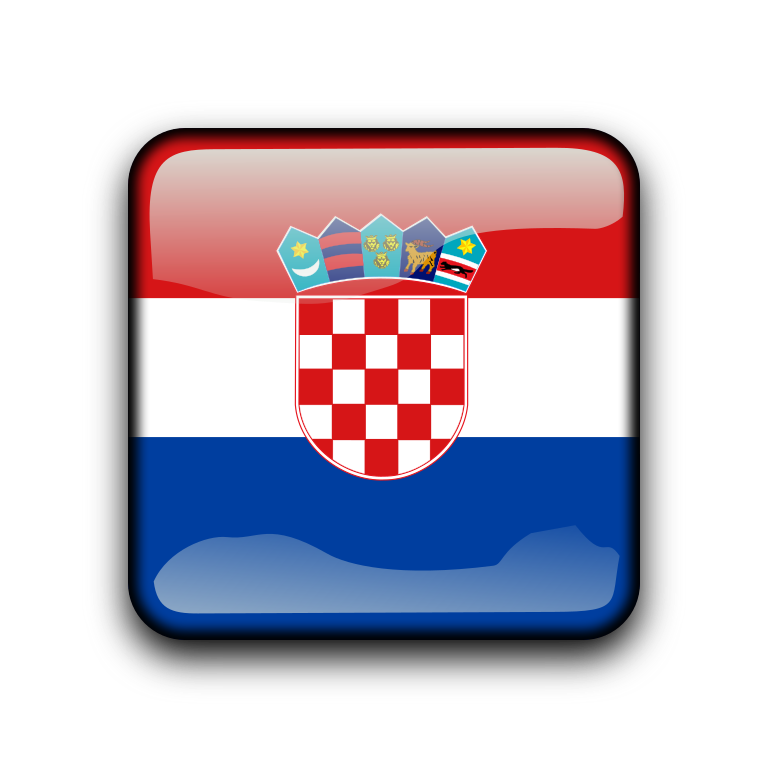 This features a square-shaped button with the flag of Croatia. The flag is predominantly red, white, and blue, with a coat of arms in the center. The coat of arms consists of a shield with five stars arranged around it. These stars are positioned at various angles, creating an interesting visual effect. The overall design of the button showcases the national pride of Croatia.