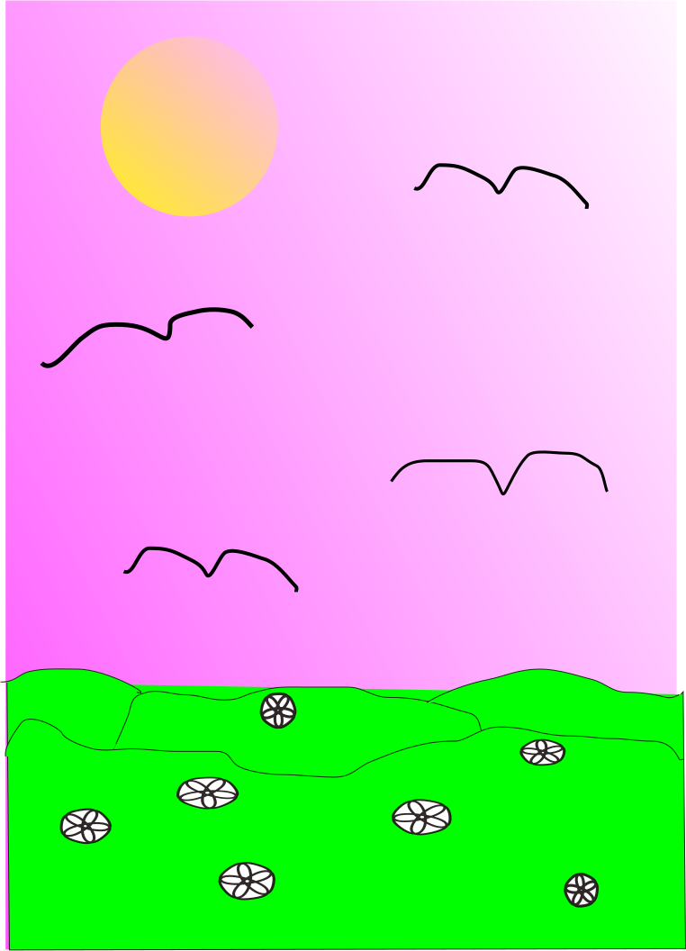 This features a beautiful scene of a field with a sunny sky above it. In the sky, there are several birds flying around in various positions, creating a sense of motion and liveliness. The birds are scattered throughout the scene, some closer to the foreground while others fly further away. The combination of the vibrant colors from the birds and the warmth of the sunny day creates an inviting atmosphere that is perfect for outdoor activities or relaxation in nature.
