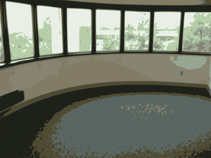 This is a black and white photo of an empty room with large windows. The room appears to be a circular space, possibly a lobby or an office area. There are several windows in the room, providing ample natural light. The room has a clean and uncluttered appearance, giving it a minimalist feel. The lack of furniture or decorations adds to the simplicity of the scene. Overall, the image conveys a sense of emptiness and openness, with an emphasis on the large windows that dominate the space.