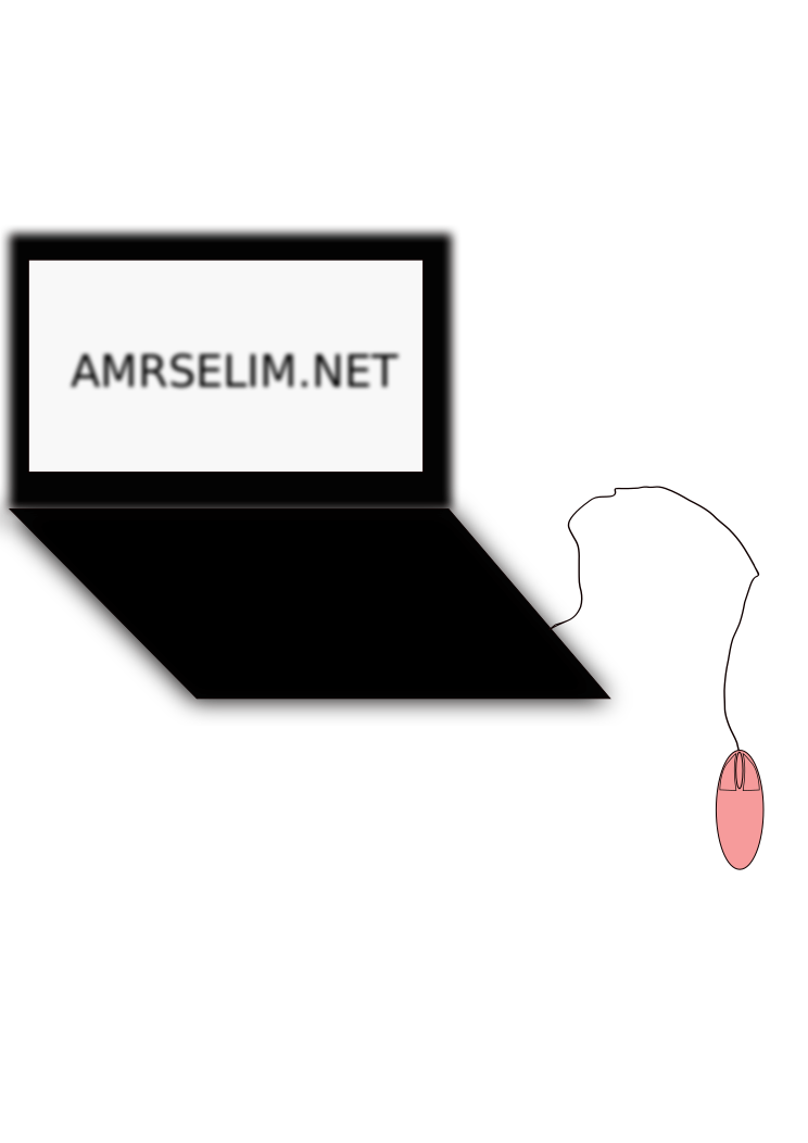 This features a laptop computer with the screen open, displaying the words "amrselem.net." A mouse is connected to the laptop and appears to be plugged into it. The mouse has a cord attached, which connects it to the laptop. This setup suggests that someone might be using the laptop for work or personal use while having the convenience of an external mouse for better navigation and control.