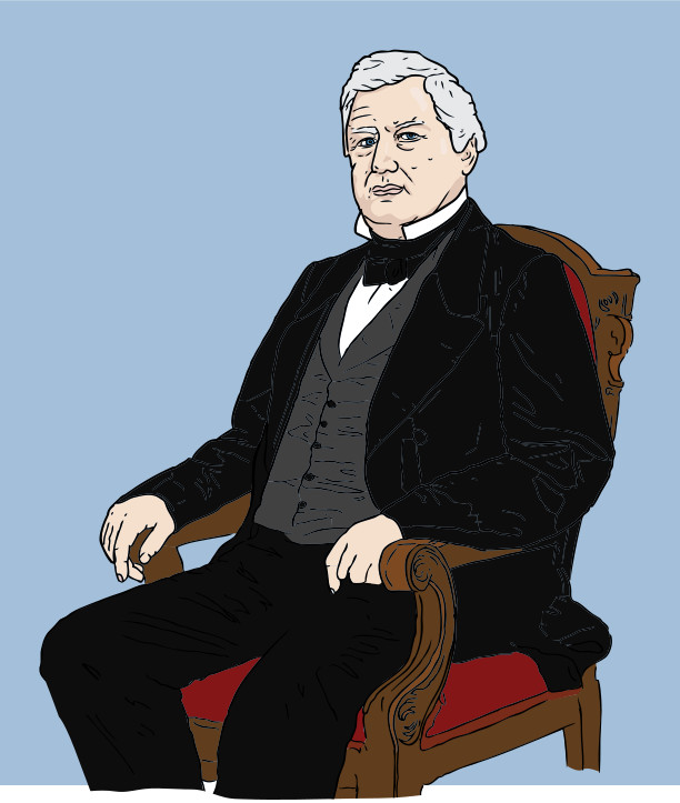 This features a man dressed in formal attire, sitting on a chair. He is wearing a suit and tie, with the tie being worn around his neck. The man appears to be an older gentleman, possibly resembling former President Millard Fillmore. The chair he sits on has a red cushion, adding a touch of color to the scene. The overall atmosphere suggests that this could be a portrait or drawing of the man in question.