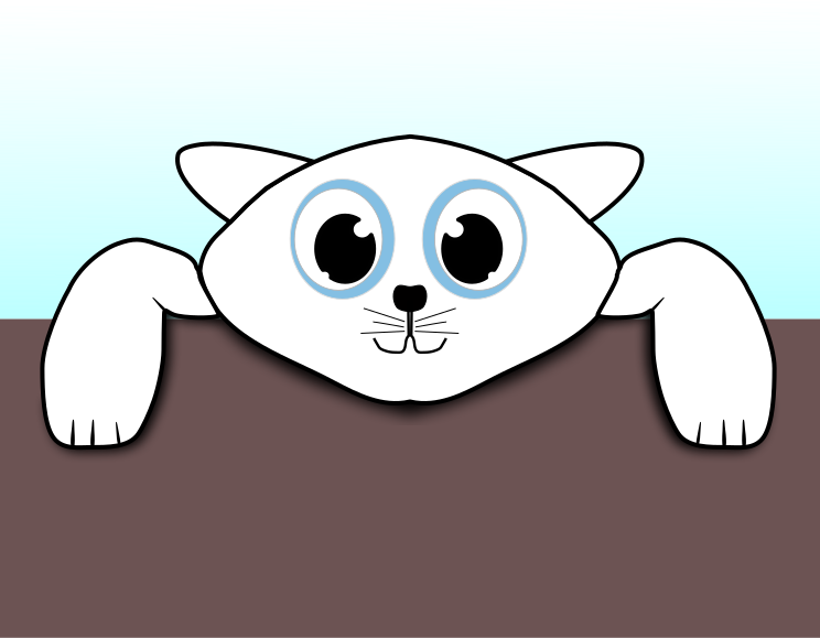 This features a white cartoon kitten with blue eyes, sitting on top of a brown surface. The kitten has its paws up and appears to be looking at the camera. It is positioned in the center of the scene, taking up most of the frame. The background consists of a light blue color that contrasts nicely with the white kitten and brown surface. This image captures a playful and adorable moment of a cartoon cat.