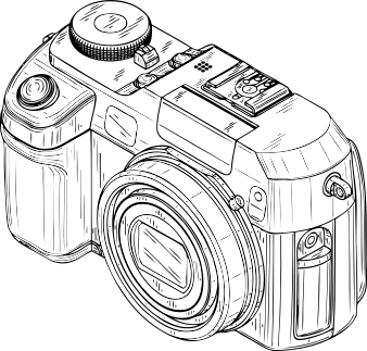 This is a hand-drawn illustration of an old camera, likely from the 1950s. It features a large lens on the front and a viewfinder on top. The camera has a wooden body with a black and white color scheme. There are two buttons visible on the side of the camera, one near the top left corner and another towards the bottom right. Additionally, there is a small square object located in the middle-right area of the image, which could be an accessory or part of the camera's design. The overall illustration gives off a vintage feel, showcasing the classic design of cameras from that era.