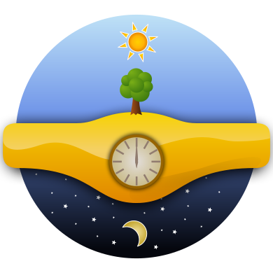 This features a round, colorful illustration of the day and night. On top, there is a sun with its rays extending outwards, representing the brightness of daytime. In contrast, on the bottom half of the image, a moon can be seen, symbolizing the darkness of night. A clock is also present in the middle of the illustration, indicating the passage of time throughout the day and night cycle. The overall design showcases the interplay between light and dark, as well as the constant movement of time.