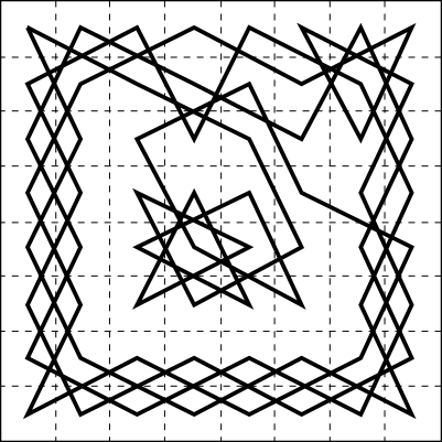 This features a black and white geometric pattern, which appears to be an intricate design. It is composed of multiple interconnected lines that create a complex and visually appealing structure. The pattern resembles a knight's tour on a chess board, with each line forming a unique shape or pattern. This artistic piece could be used as a decorative element in various settings, such as wallpaper, fabric, or even tattoo designs. Its intricate nature and striking appearance make it an interesting focal point for any space where it is displayed.