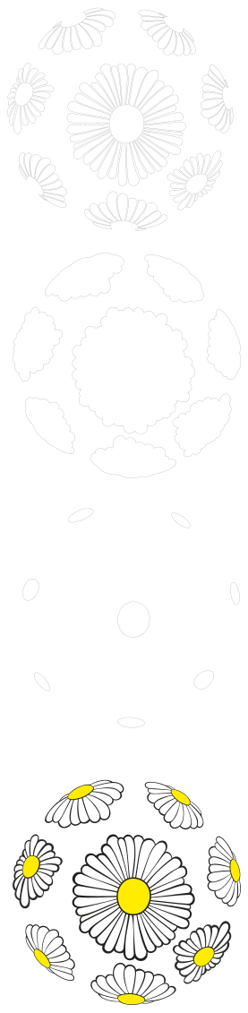 This features a large, empty white canvas with a few decorative elements scattered across it. There are several yellow flowers placed in various positions on the canvas, adding a touch of color to the otherwise plain background. Additionally, there is a small design element that resembles a flower, located towards the left side of the canvas. The combination of these decorative elements creates an interesting and visually appealing scene.